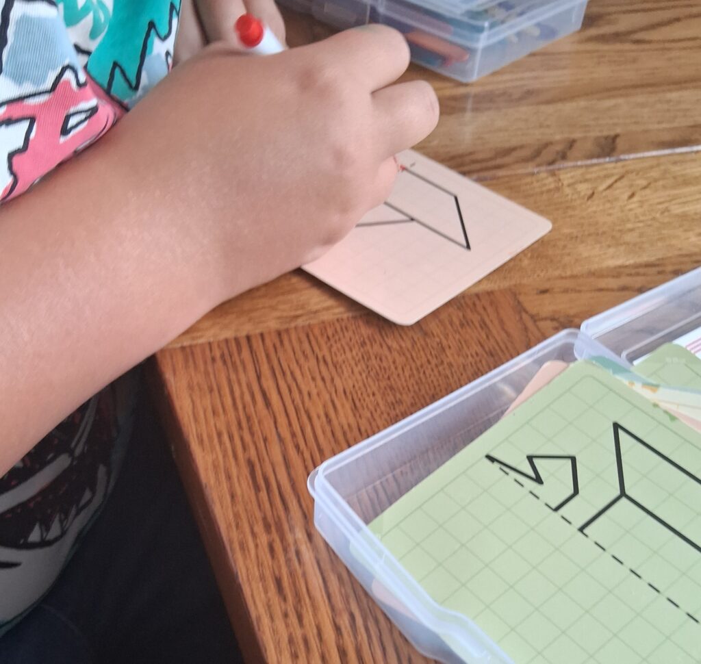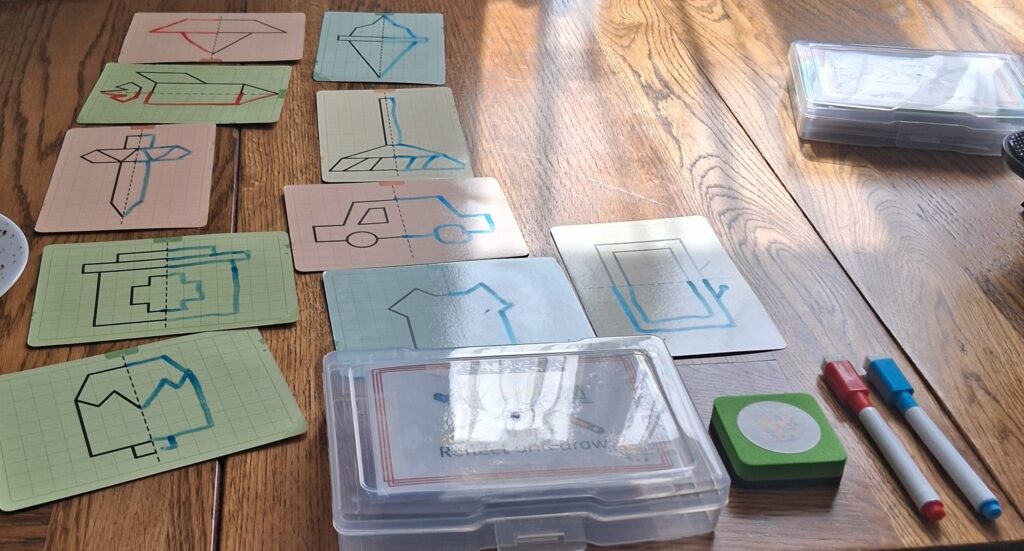 This contains some double-sided laminated images on squared card for children to copy exactly underneath, using the red and blue felt tipped pens.