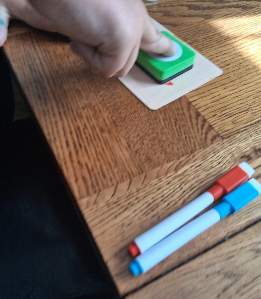The child’s felt tip drawing can then be wiped away with the included rub-off pad so they can start it all over again, if wanted.