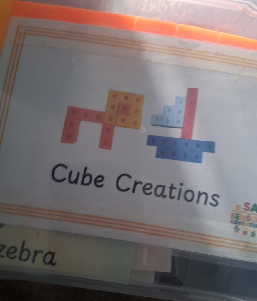 In this slightly larger box there are colourful , smooth plastic blocks ( that also have a hole for joining them together, again children can explore the texture of the box contents) these can be joined together to make anything the child wants! There are some laminated pictures for children to copy designs from, or they can use imaginary skills to make their own creations